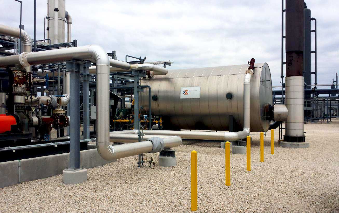The pre-engineered HC2 thermal fluid heater is available in standard sizes from 500,000 to 100 MM BTU/hr. Configuration options include vertical up-fired, vertical down-fired, and horizontal. This system is skid mounted with a burner and integrated control panels.